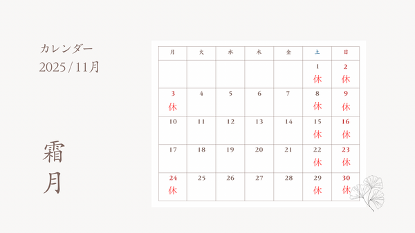 「休」と記載の日の発送とお問い合わせは定休日明けに順次対応いたしますのでご了承ください。ご注文は年中無休で受け付けております。